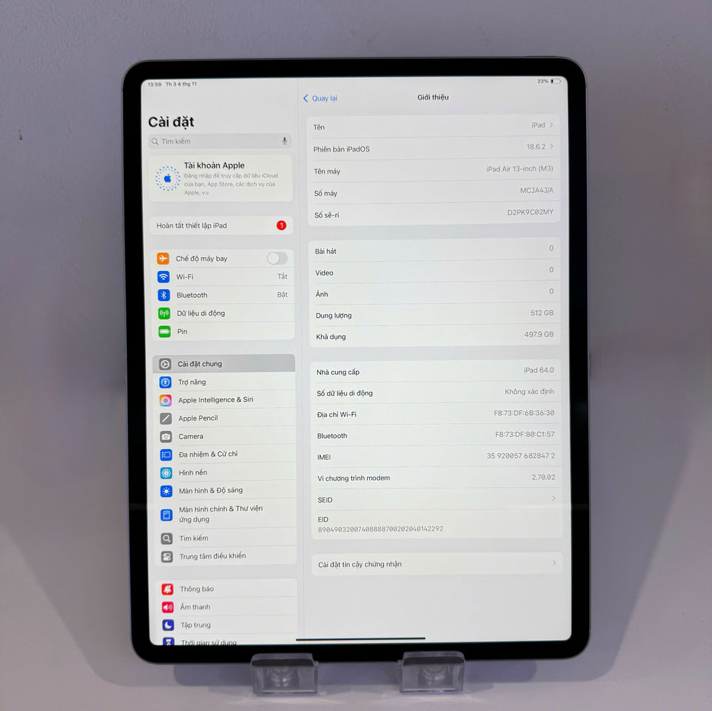 iPad Air M3 sở hữu pin Li-Po 36.59 Wh, cung cấp đến 10 giờ sử dụng liên tục khi lướt web hoặc xem video qua WiFi, đảm bảo đáp ứng nhu cầu làm việc và giải trí cả ngày. Ngoài ra, thiết bị còn hỗ trợ sạc nhanh qua cổng USB-C, giúp nạp đầy pin trong thời gian ngắn, phù hợp với những ai thường xuyên di chuyển hoặc làm việc nhiều giờ liên tục mà không muốn bị gián đoạn.