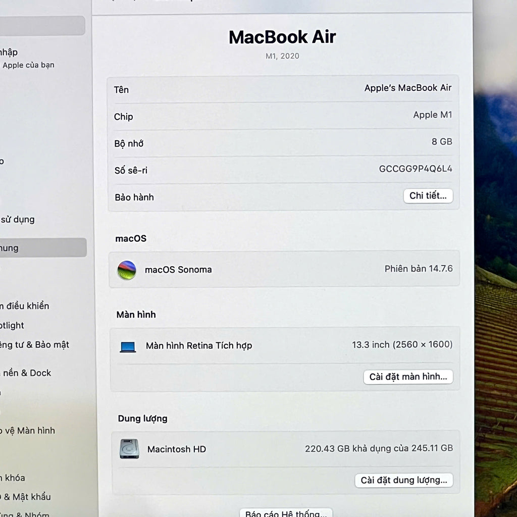 Macbook Air 2020 13.3in Xám Apple M1/RAM 8GB/SSD 256GB 98% sạc 39 lần BPTN