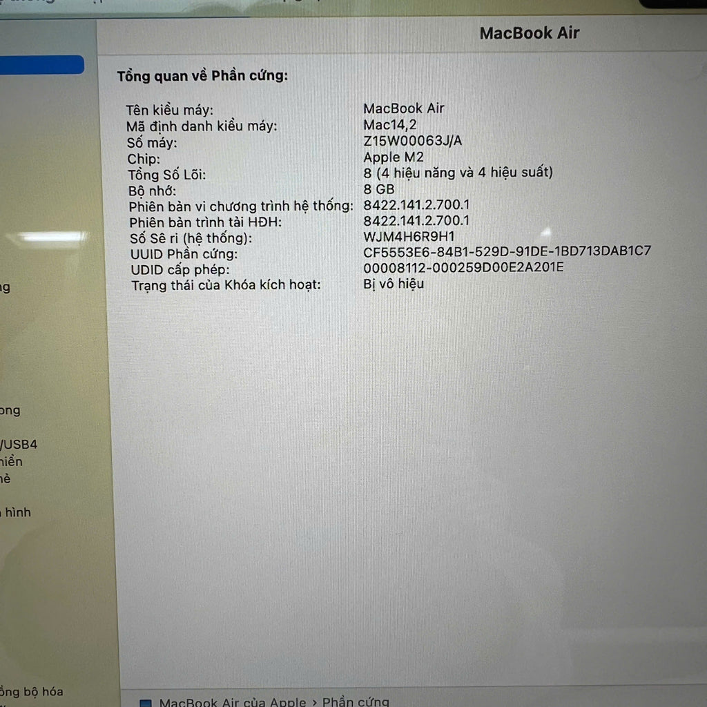 Macbook Air 2022 13.6in Bạc Apple M2/ RAM 8GB/ SSD 256GB 98% sạc 36 lần BPTN
