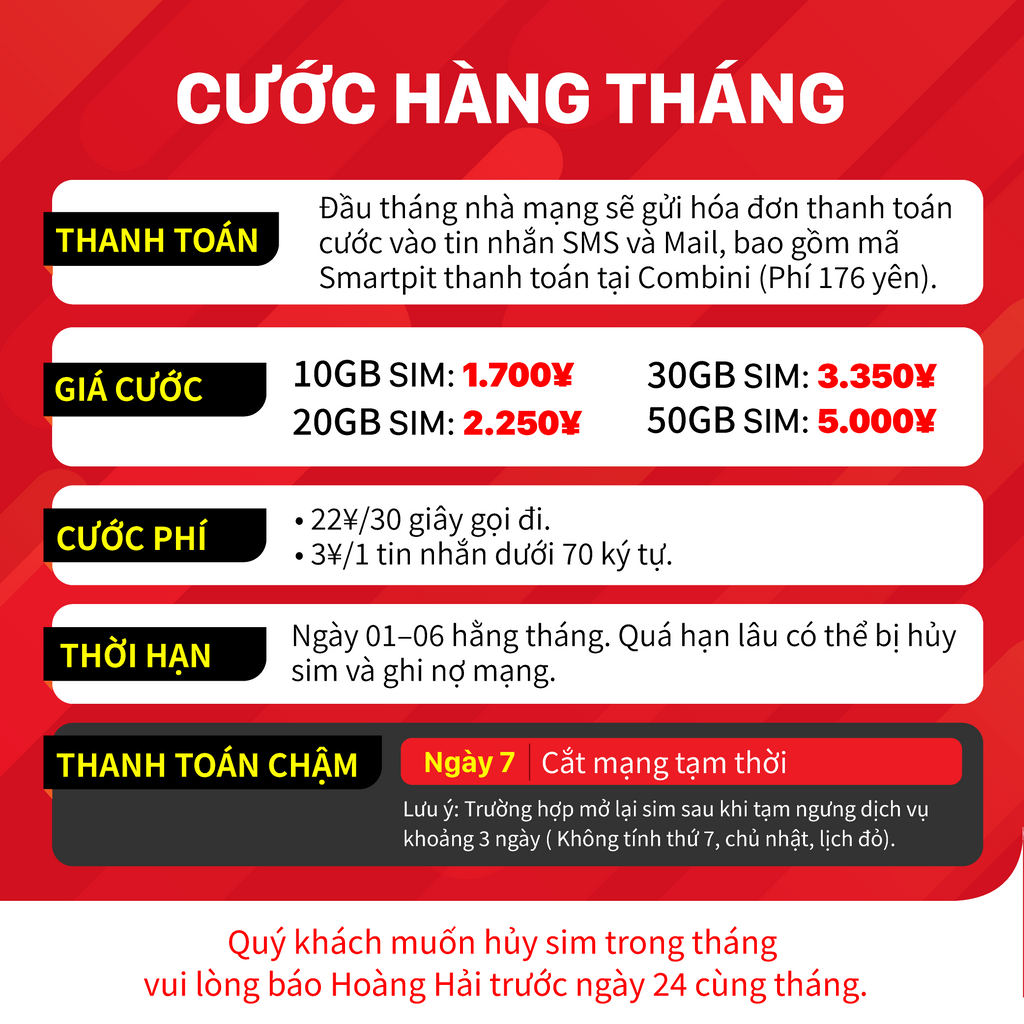 • Đầu tháng nhà mạng sẽ gửi hóa đơn thanh toán cước vào tin nhắn SMS và Mail, bao gồm mã Smartpit thanh toán tại Combini. • Thời gian đóng từ ngày 01 đến 06. qua ngày 07 sẽ bị cắt mạng, đóng cước sẽ có mạng trở lại, để lâu sẽ bị hủy và nợ mạng.
